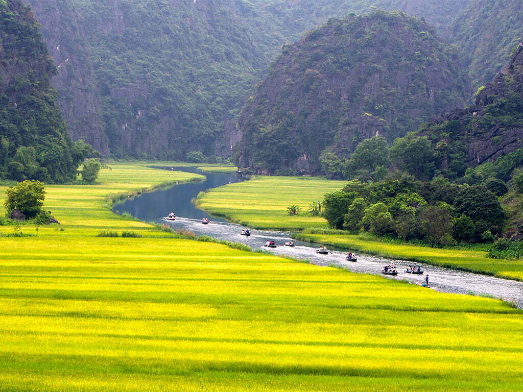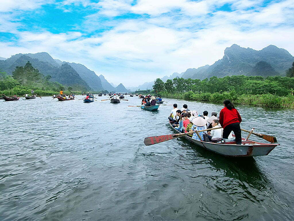Barques et touristes vogant entre les montagnes de Ninh Binh