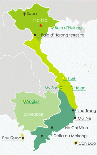 Les Incontournables du Vietnam sur une carte du Vietnam
