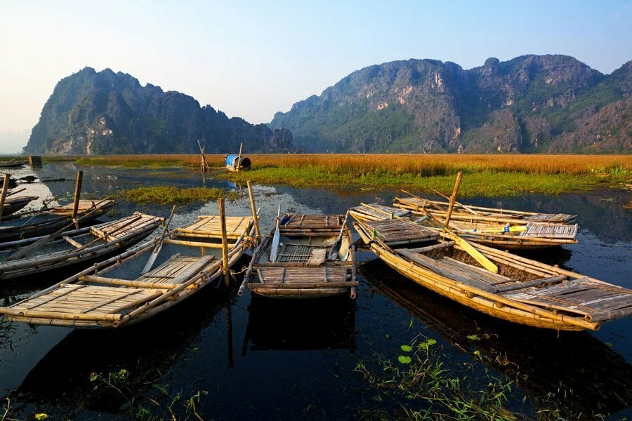 Pause zen dans le calme d’un tableau de rizières ondulantes nichées au coeur d’un décor de pitons calcaires où la vie paysanne s’affaire dans le décor bucolique des paysages poétiques et sereins de Thung Nham.