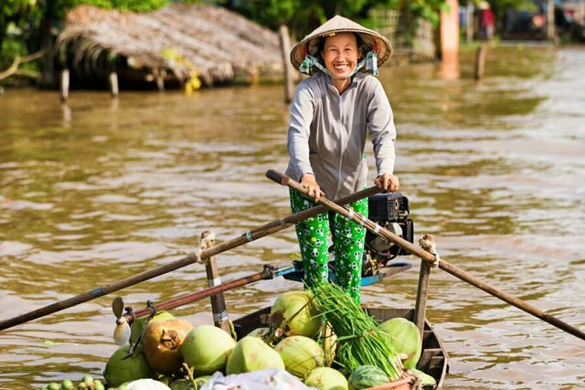 Les marchés flottants du Mekong sont une immersion dans l’univers animé du commerce fluvial où des énormes barges croulant sous le poids des fruits et légumes commercent au quotidien et le sillonnent sans relâche.