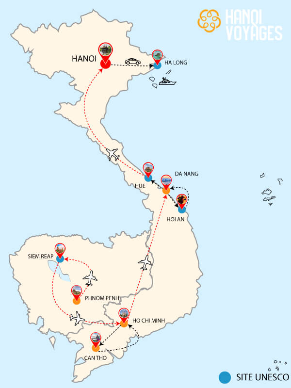 Transfert en voiture privée à l’aéroport pour le vol vers HANOI. Vous serez accueilli dès votre arrivée à l’aéroport par le guide pour commencer les visites.