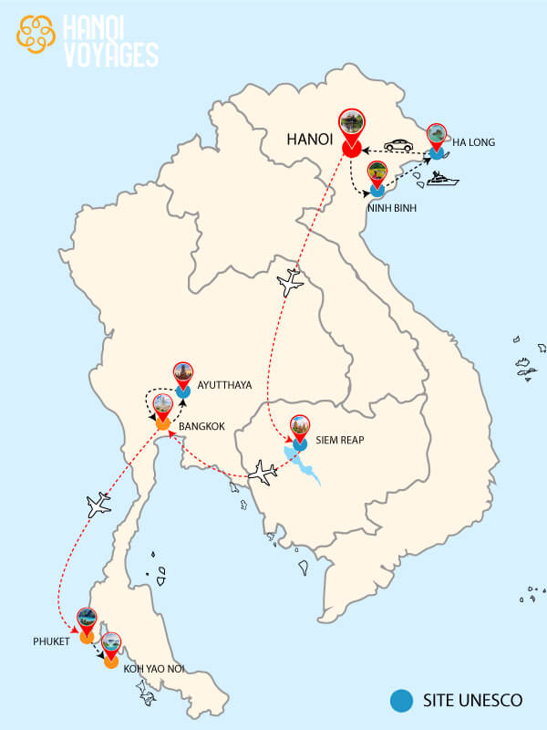 Hanoi > Croisière en baie d’Halong > Siem Reap > Temples d’Angkor > Tonle Sap > Bangkok >  Ayutthaya > Koh Yao Noi