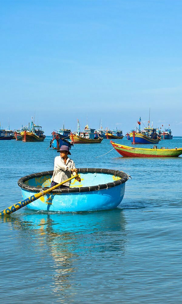MUINE A 4 h de voiture de HCM, Muine est la station balnéaire des habitants de Ho Chi Minh. La plage est séparée de l’activité de la ville par une rue centrale bordée d’hôtels, de boutiques et de restaurants. Bateaux de pêcheurs colorés, petits bateaux-paniers, tout ronds, tressés en bambou qui dansent sur les vagues avant de décharger sur le sable le poisson tout frais pêché, et une multitude de femmes au chapeau conique qui s’affairent à vider les sacs,…(Lire la suite)