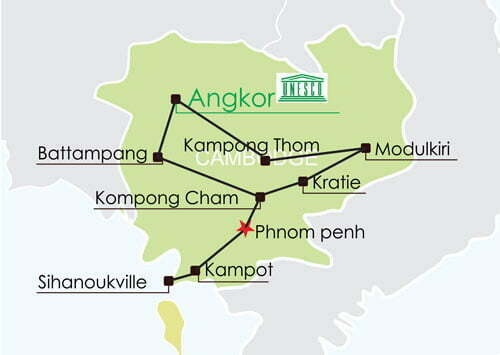 • Battambang :  Battambang est la 2ème ville du Cambodge, en bordure de la rivière Sagker. Dans un environnement de campagne et de rizières à perte de vue, cette petite bourgade colorée, au charme khmère, mène une vie traditionnelle et authentique avec ses marchés et ses villages artisanaux.
